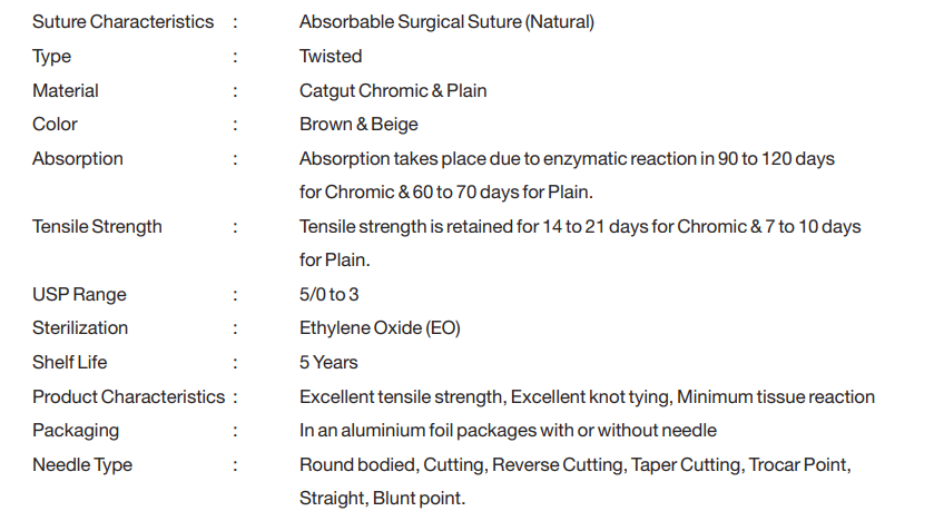 VINGUT – Catgut Chromic is an absorbable, sterile, surgical gut suture composed of purified connective tissue (collagen) derived from the sub mucosal fibrous layer of healthy sheep intestines. Catgut Chromic is processed to provide greater resistance to absorption, chromic catgut treated with chromic salts to delay the absorption.