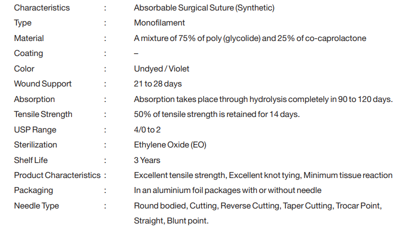 Poliglecaprone 25 sutures are indicated for use in general soft tissue approximation and/or ligation, including use in Female’s skin approximation, Subcutaneous approximation, General surgery, Plastic surgery, Microsurgery, Ophthalmic surgery, Gynecology, Trichology and Orthopedics