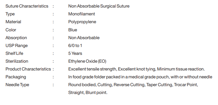 Monofilament Polypropylene Suture is indicated for use in general soft tissue approximation and/or ligation, including use in cardiovascular, ophthalmic neurological procedures, General Surgeries, Gynecological, Orthopedics, Endoscopic surgery, Skin Closure, Hard Tissues approximation, Ligament Repair and Mesh Fixation.